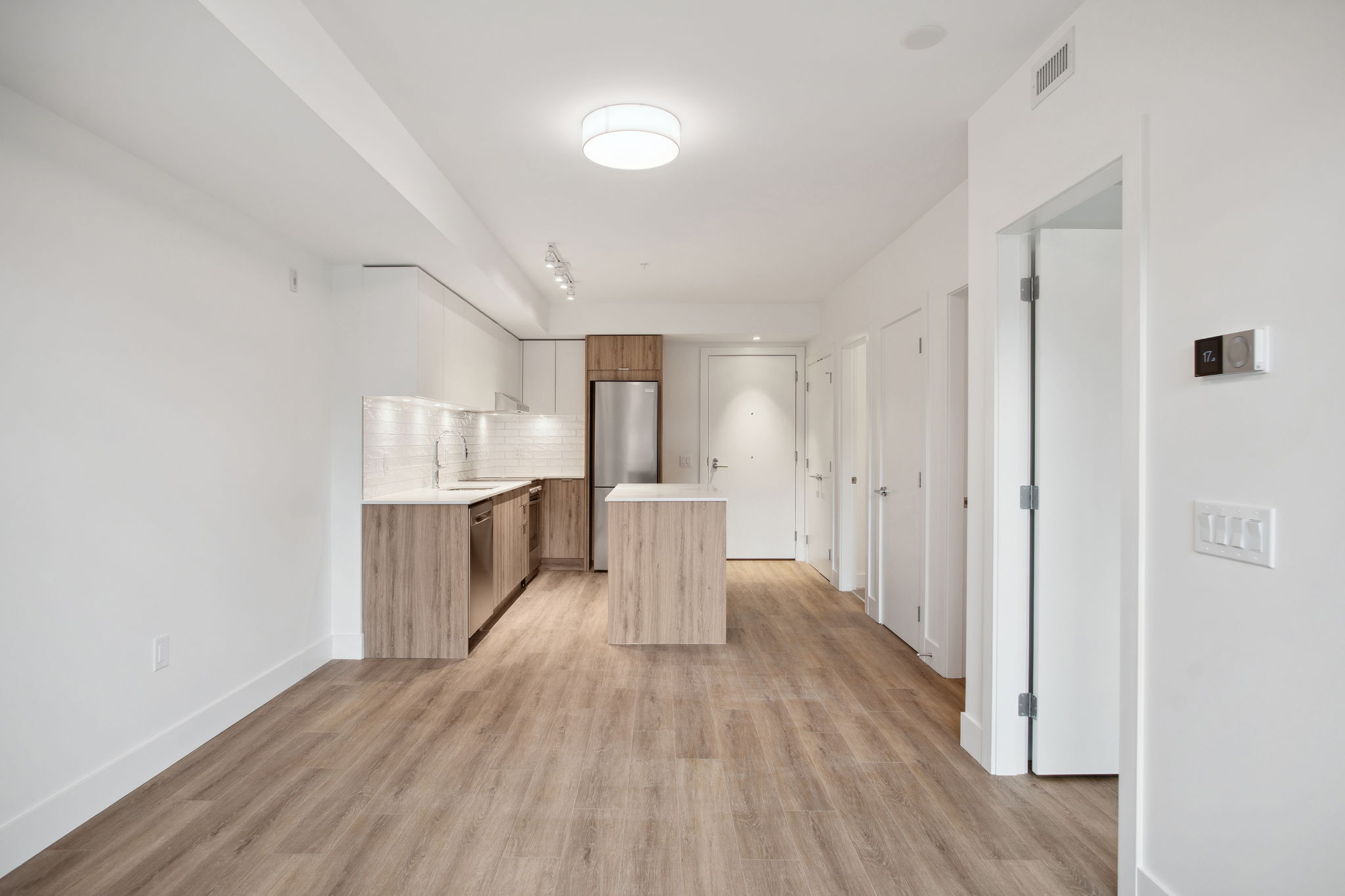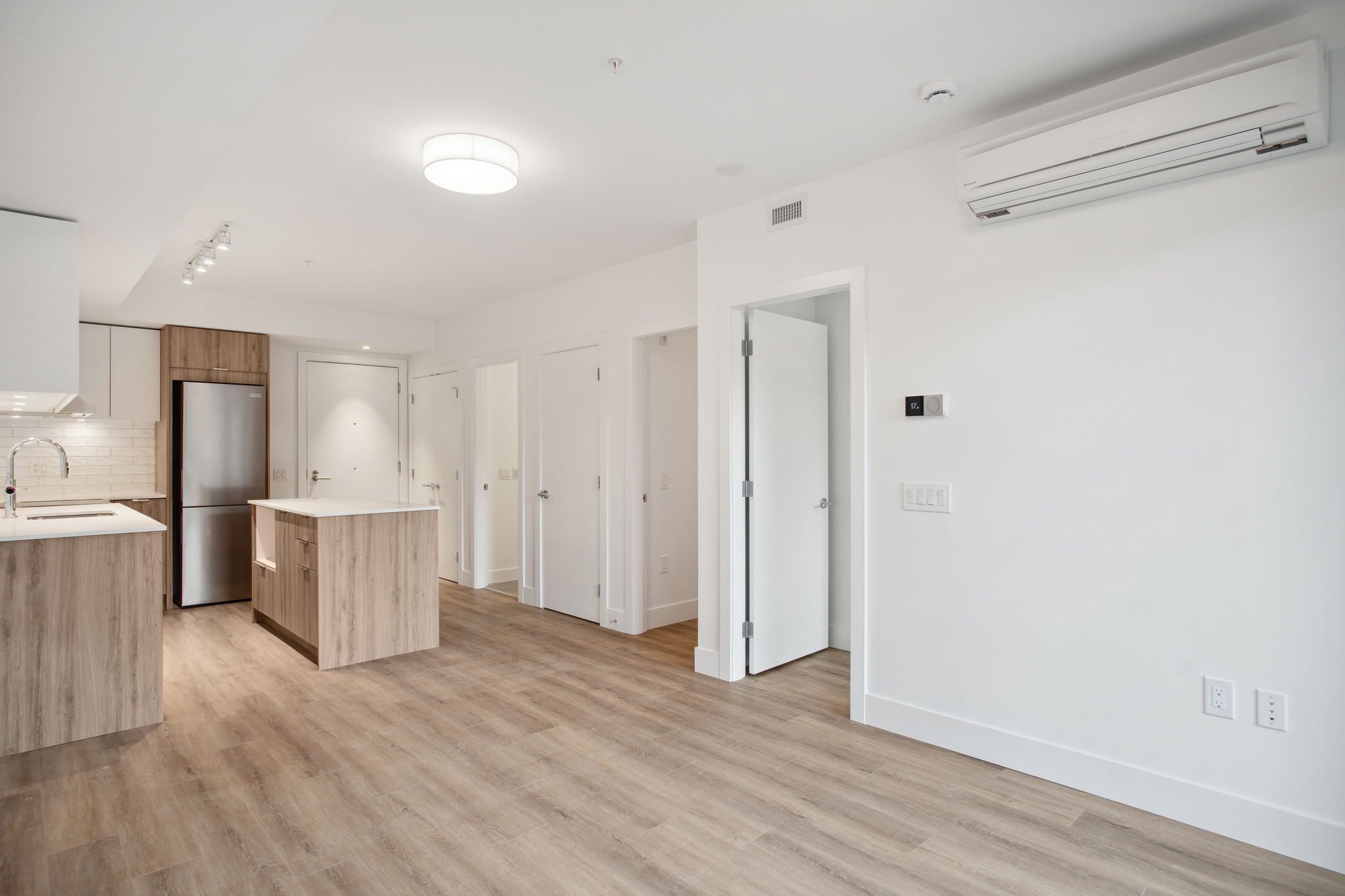 An efficient plan with the added bonus of a flex room for work or storage. The living area extends toward the balcony, where windows capture mountain views. Modern appliances, air conditioning, and in-suite laundry come standard.