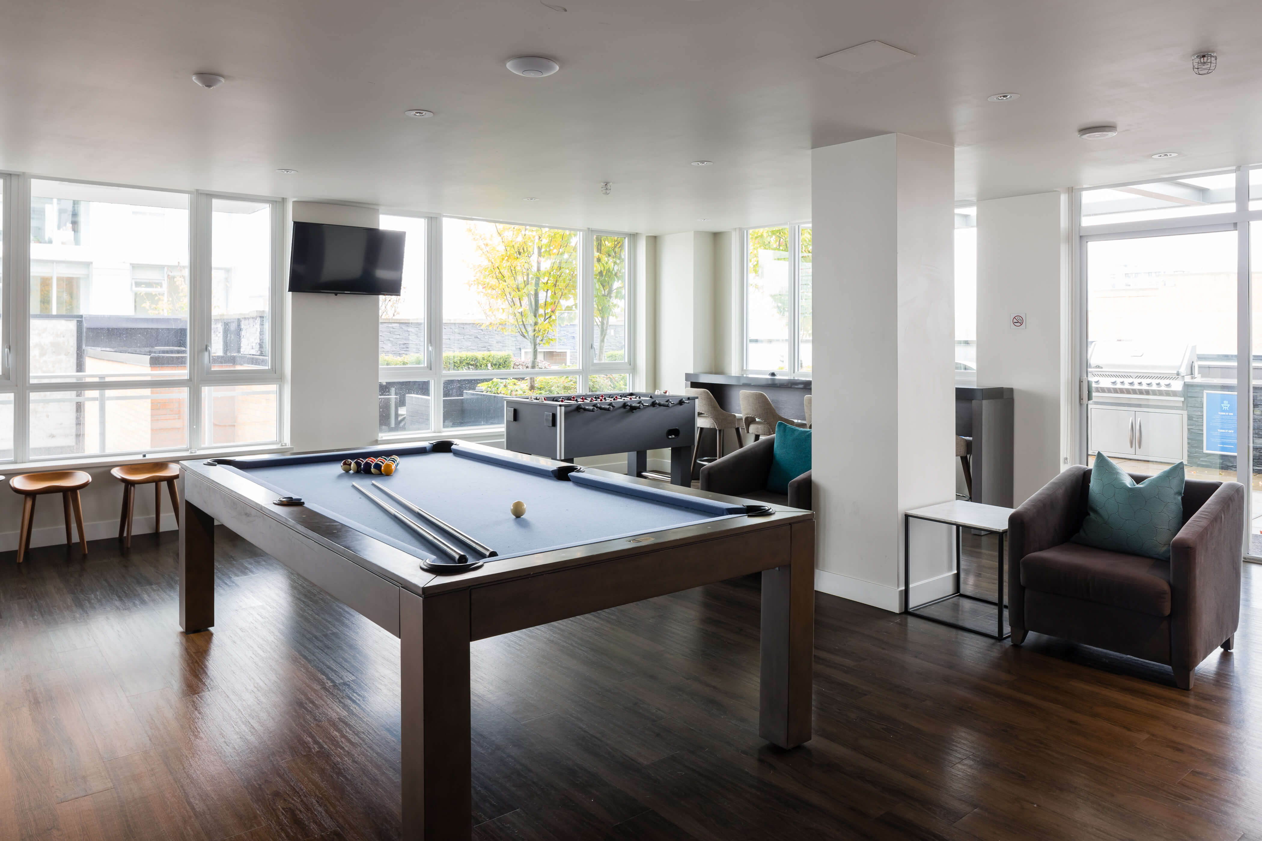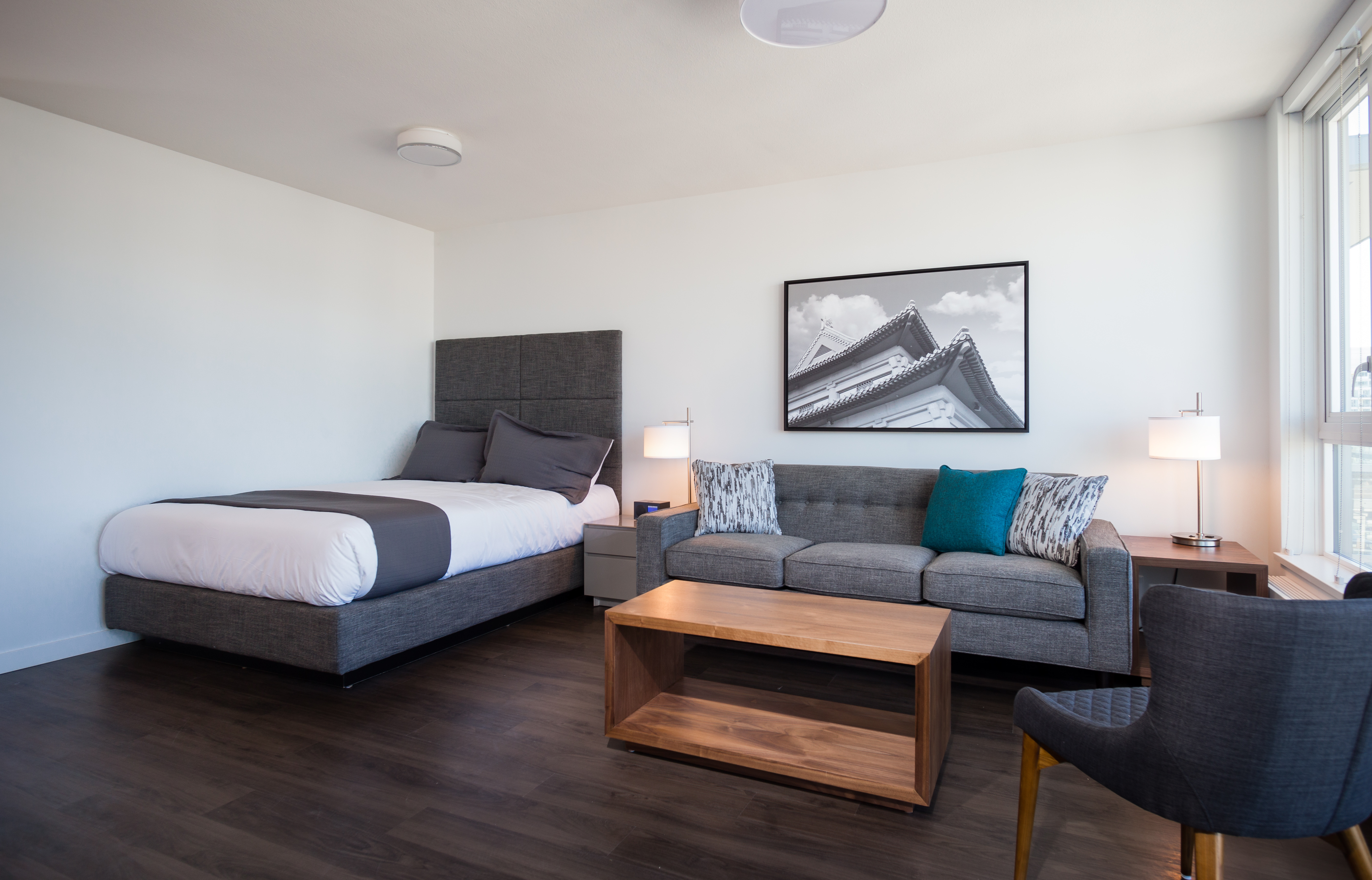 Our A3 studio plan is the largest of our studio suites, it also includes a separate office or flex space. The suite features modern finishes including: stone countertops, vinyl plank floors and a full appliance package. Relax on the west-facing balcony and take in the amazing views of Downtown Vancouver, the mountains, and ocean.