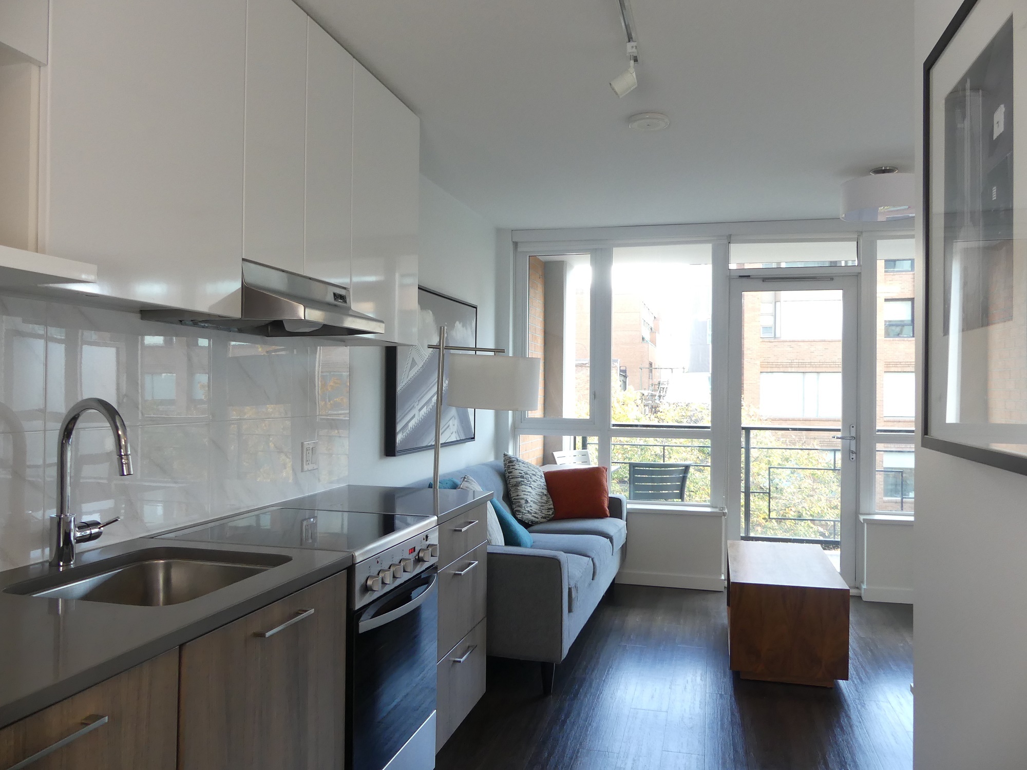 Facing East, our A1 studio plan comes semi-furnished with a Murphy bed, couch, dining table, patio table, wall-mounted television, and even an Apple TV. The suite features modern finishes including: stone countertops, vinyl plank floors and a full appliance package. Relax on the large patio, perfect for people watching below on Main Street.