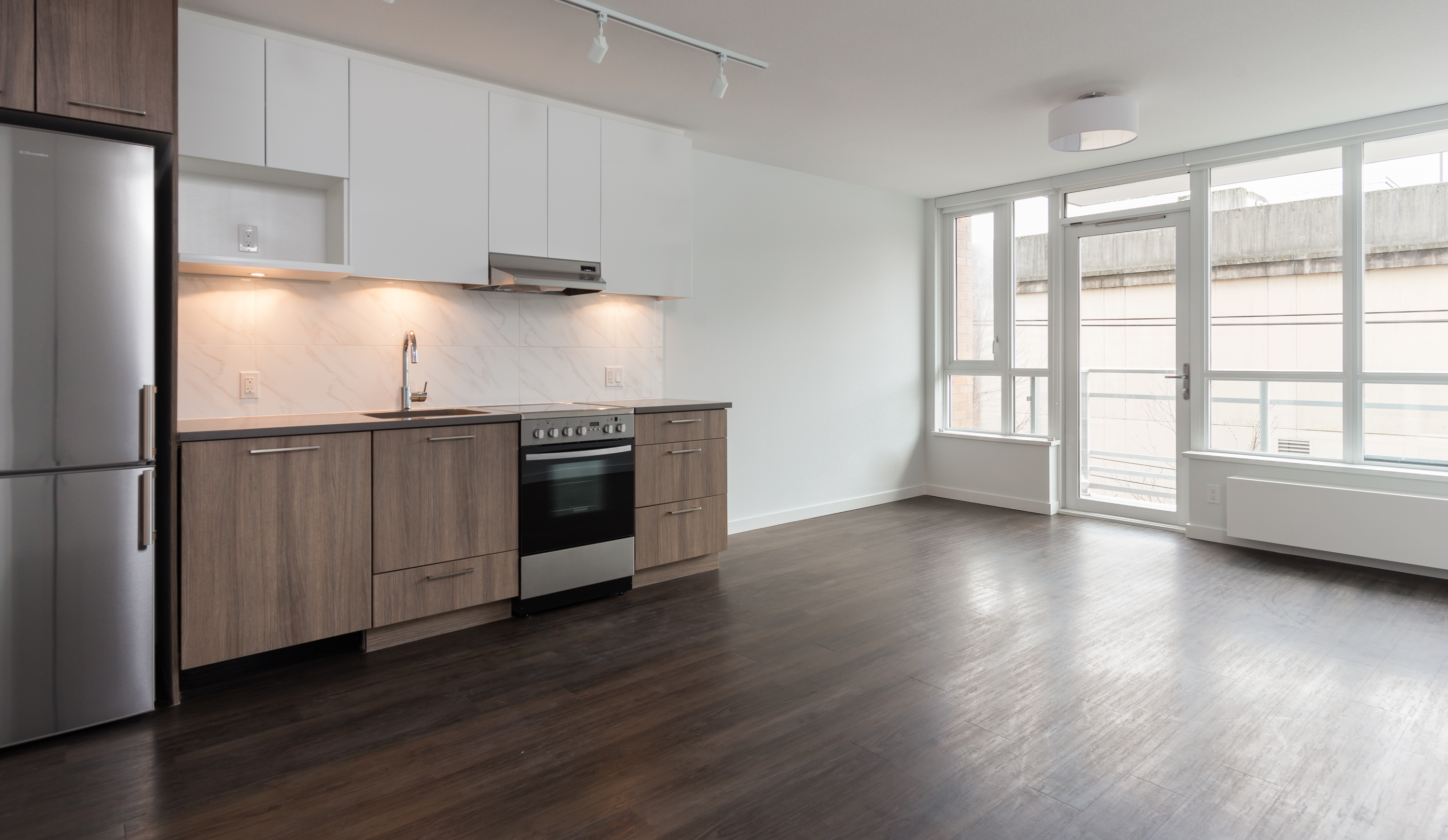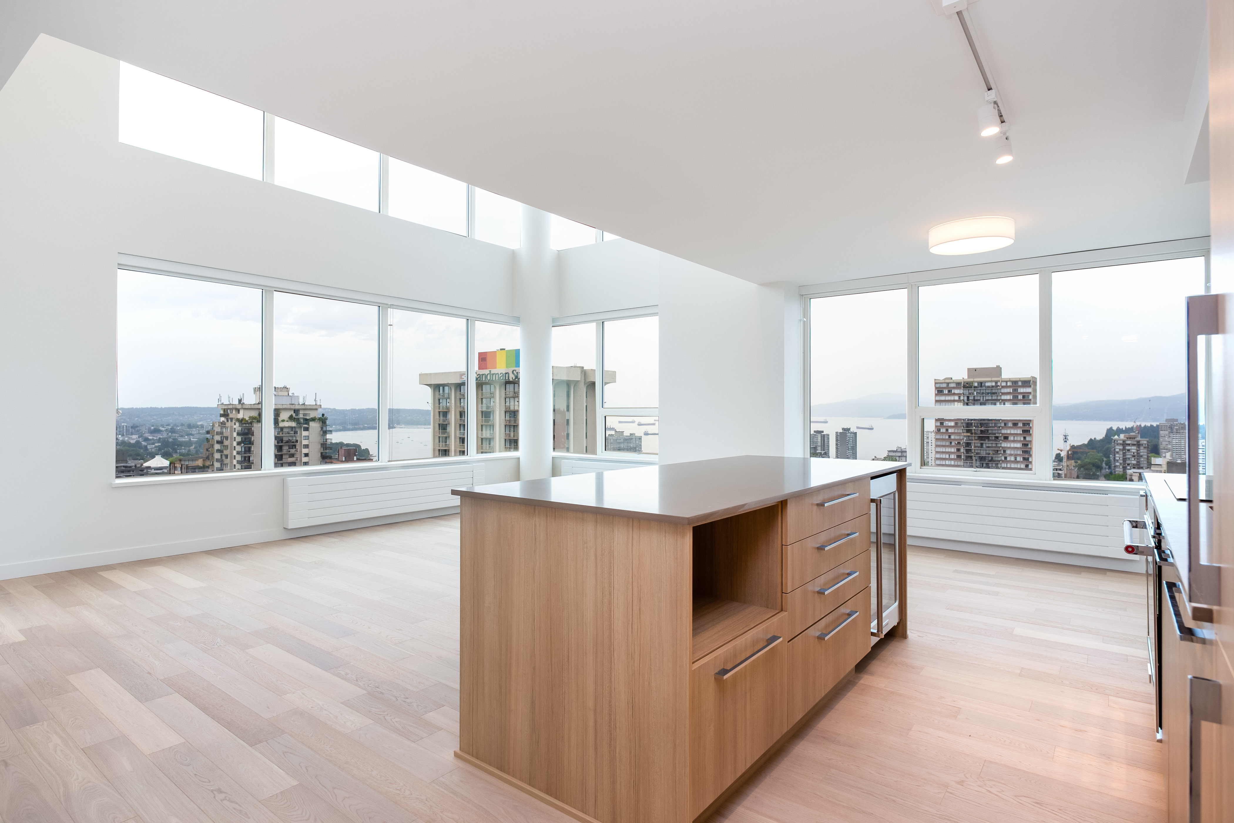 This junior 1BR and flex suite allows maximum flexibility with its separate office and transforming bedroom walls. The suite features modern finishes including: stone countertops, vinyl plank floors and a full appliance package. Relax on the west-facing balcony and take in the unbeatable views of Downtown Vancouver, the mountains, and the ocean.