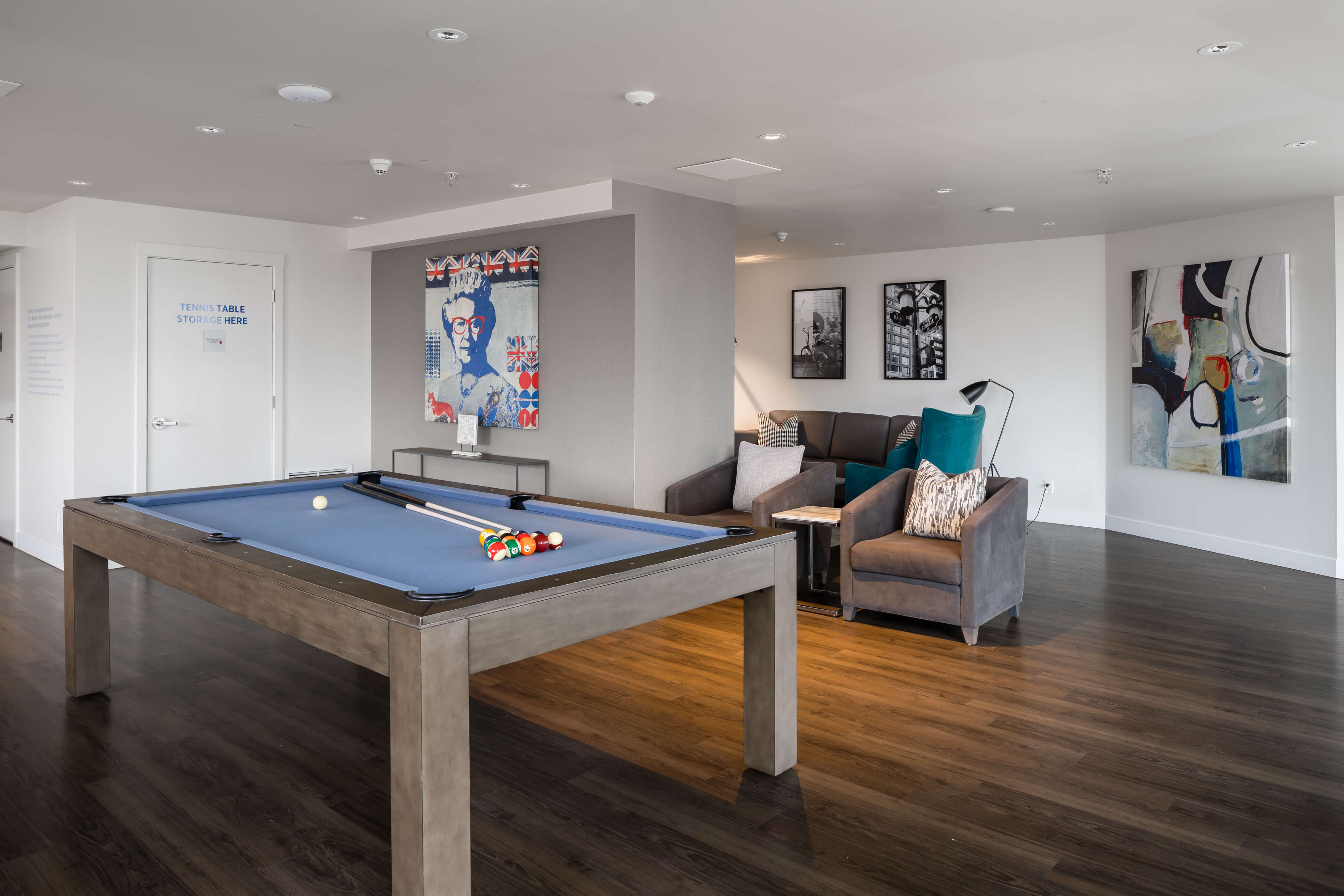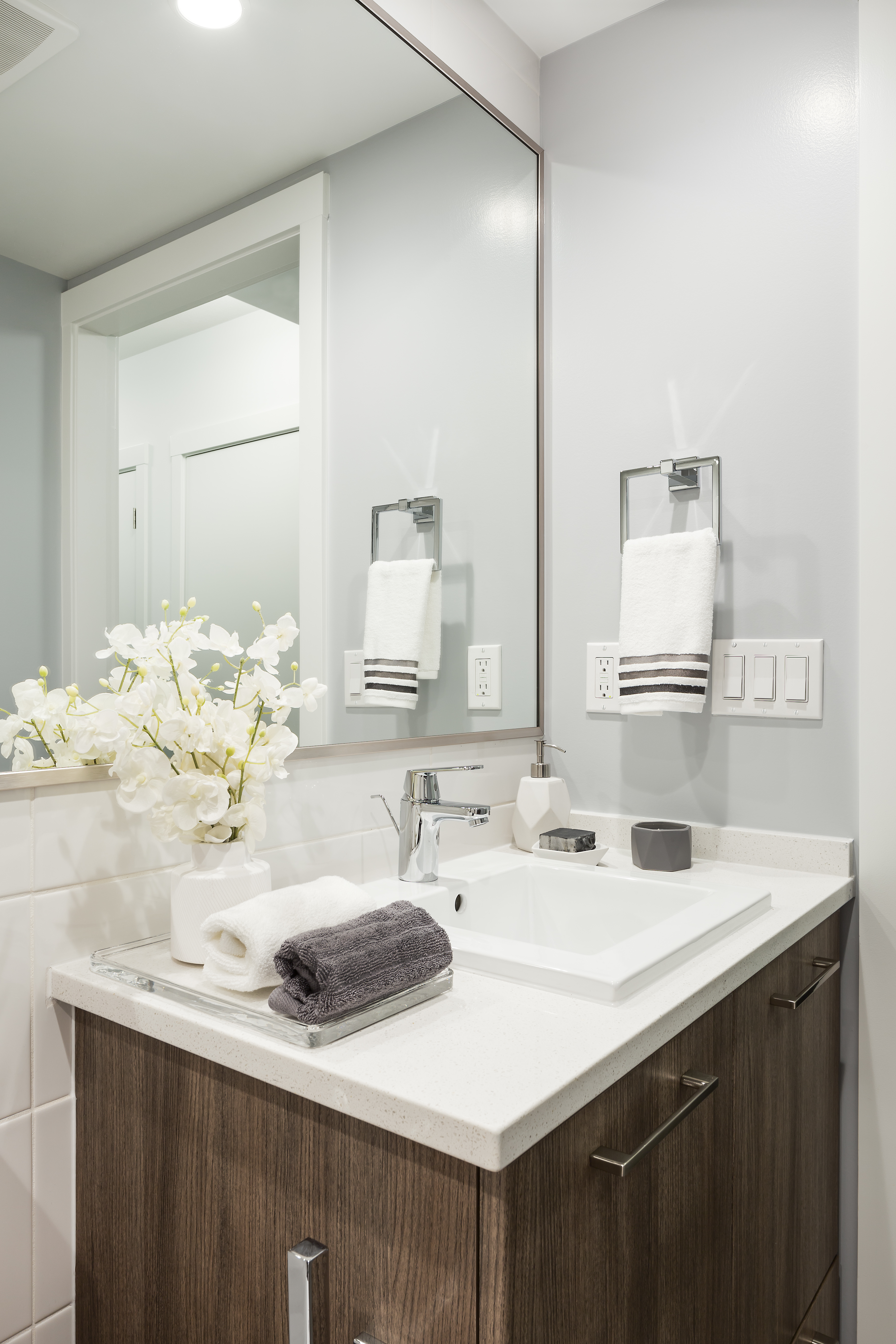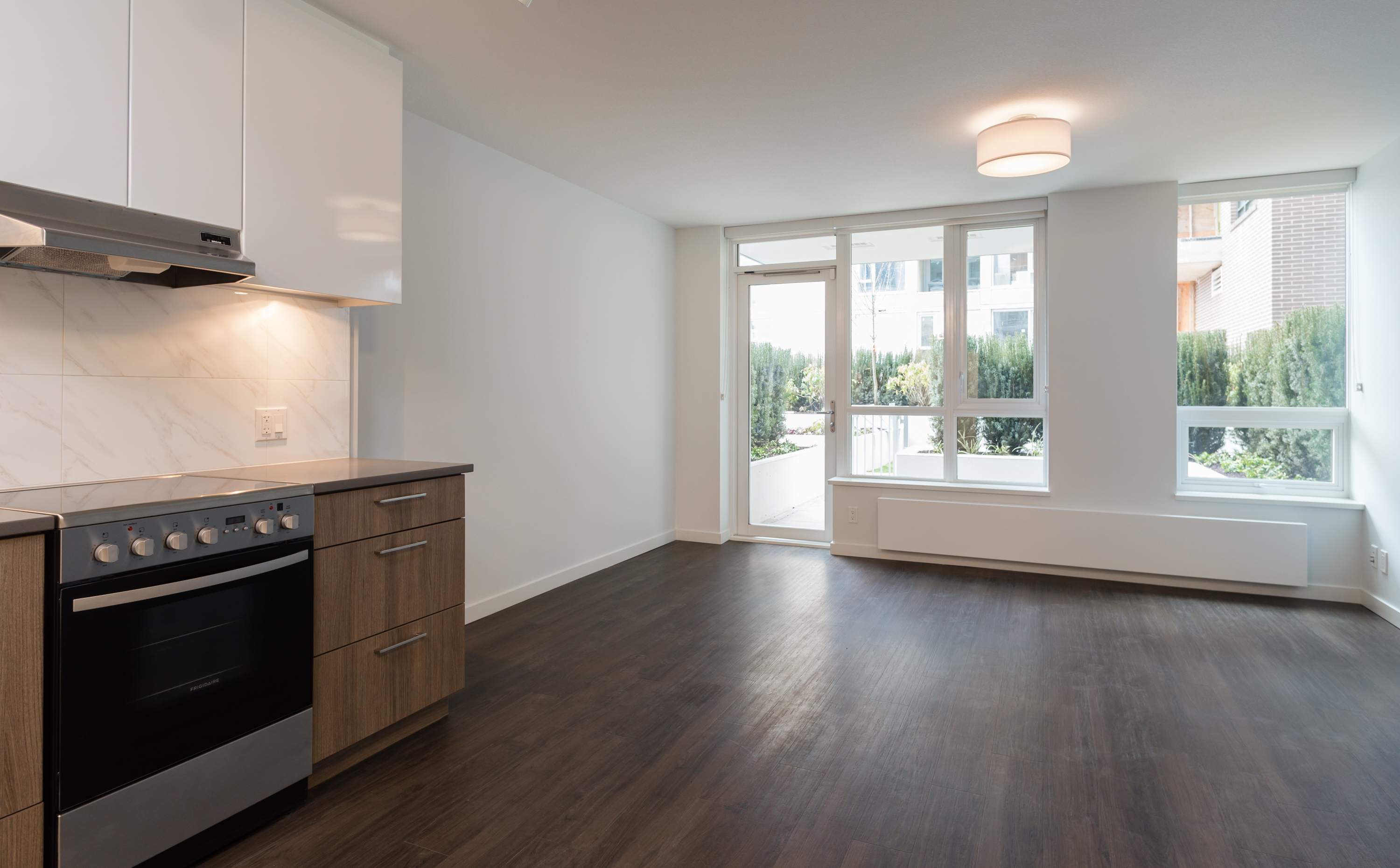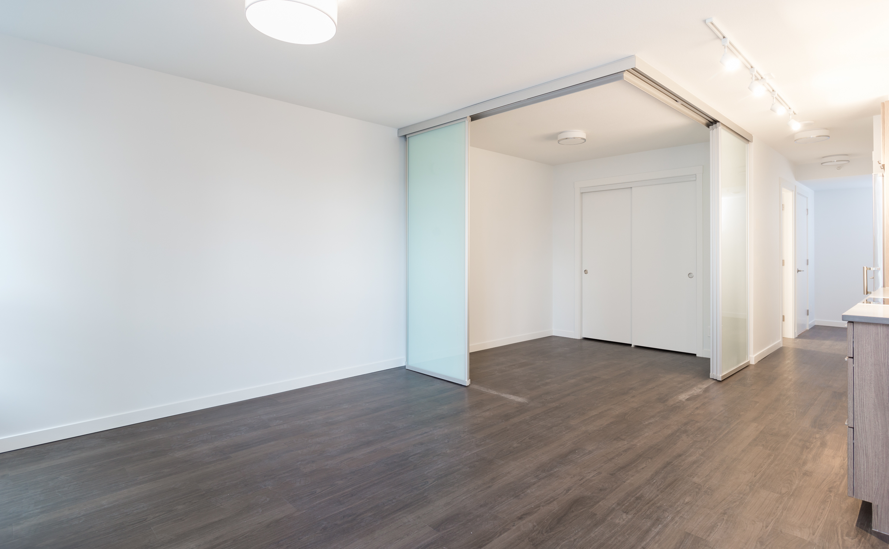 This suite allows for maximum flexibility with a separate office or flex space, and transforming walls that move to fit your needs. The suite features modern finishes including: stone countertops, vinyl plank floors and a full appliance package. Located on the north-west side of the building, this suite faces out to our tranquil 2nd floor garden level on the lower floors, and offers views of the North Shore mountains, Downtown Vancouver, and peek-a-boo ocean views on the upper floors.